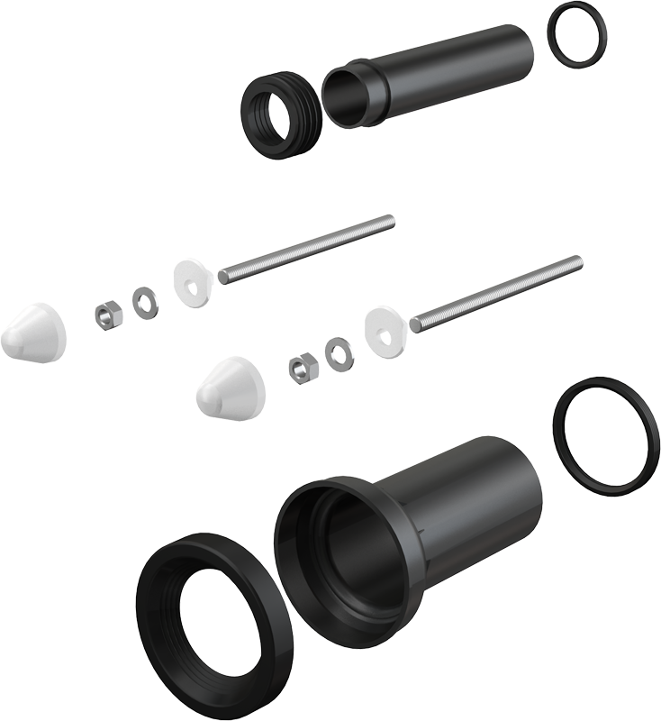 Крепежный материал для крепления унитаза: шпилька М12 – 2 шт., шайба – 4 шт., колпачок – 2 шт., гайка – 2 шт., гофрированный рукав – 2 шт.