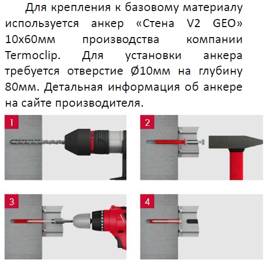 Для крепления к базовому материалу используется анкер «Стена V2 GEO» 10х60мм производства компании Termoclip. Для установки анкера требуется отверстие Ø10мм на глубину 80мм. <br>