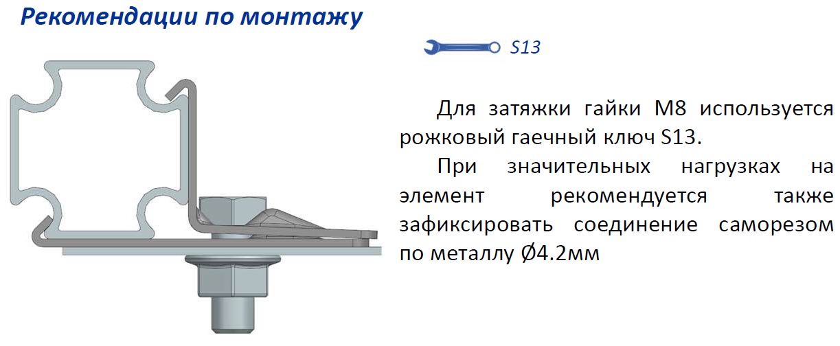 Для затяжки гайки М8 используется рожковый гаечный ключ S13.