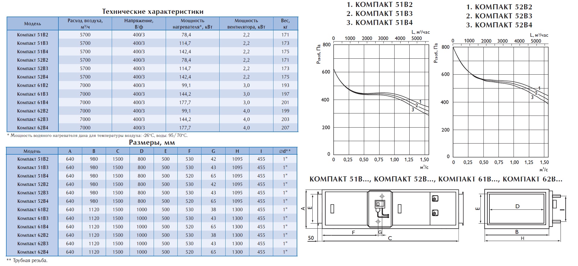 В компактном тепло, звукоизолированном корпусе с толщиной изоляции 25 мм размещены: фильтр класса очистки G3, водяной калорифер и вентилятор с загнутыми вперед лопатками (двигатель с короткозамкнутым ротором в установках Компакт-6 или энергоэффективный электронно-коммутируемый двигатель (EC-двигатель) в установках Компакт-6 ЕС). Для индикации степени загрязнения фильтра предусмотрен датчик давления.