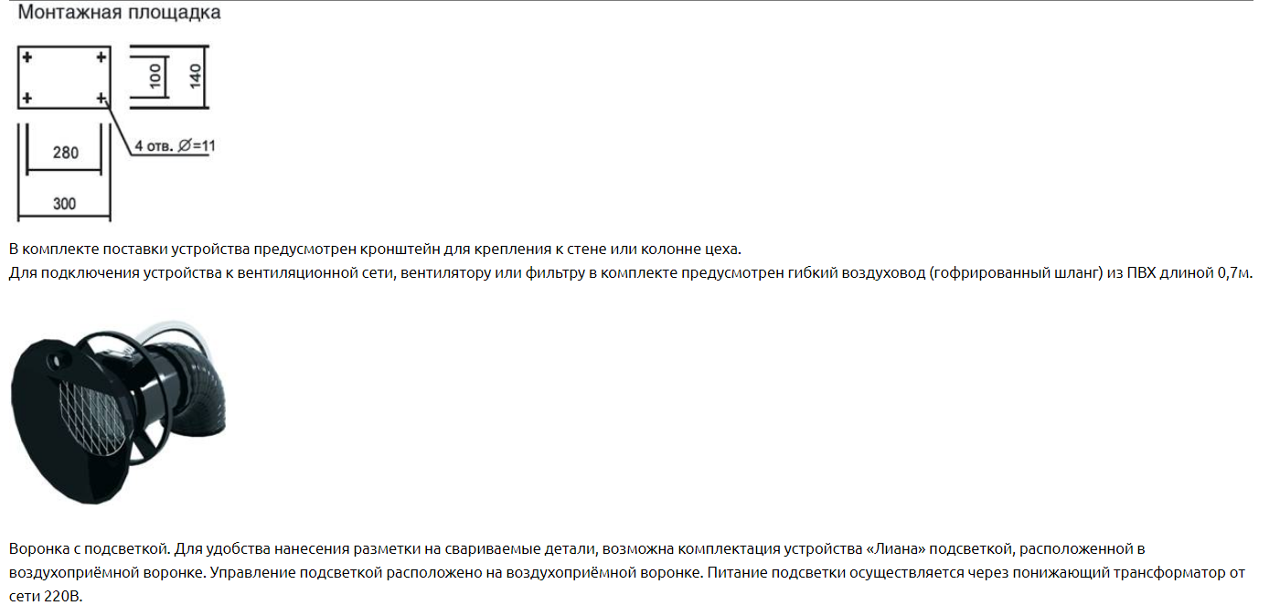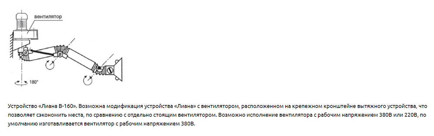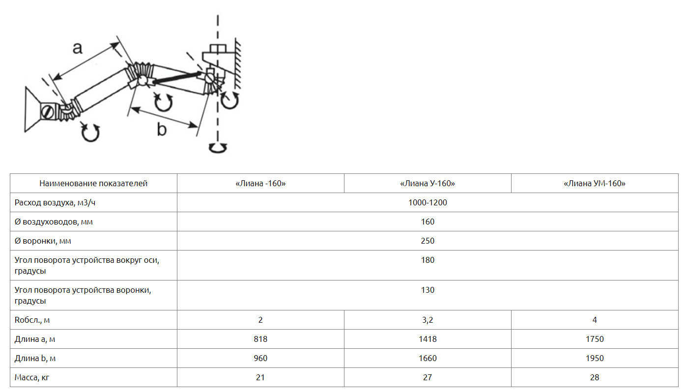 Выпускаемые устройства диаметром воздуховодов 160мм диаметром воронки 250мм рассчитаны на расход воздуха 1000-1200 м3/ч. Устройства «Лиана-160» может быть радиусом обслуживания 2м (без индекса), 3,2м (с индексом «У»), 4м (с индексом «УМ»). В конструкции устройства предусмотрен кронштейн для крепления к стене или колонне цеха. Рекомендуемая высота установки устройства 2-2,25м. Устройство верхнего подключения (под опорой). Для подключения устройства к вентиляционной сети, вентилятору или фильтру в комплекте предусмотрен гибкий воздуховод (гофрированный шланг) длиной 0,7м.