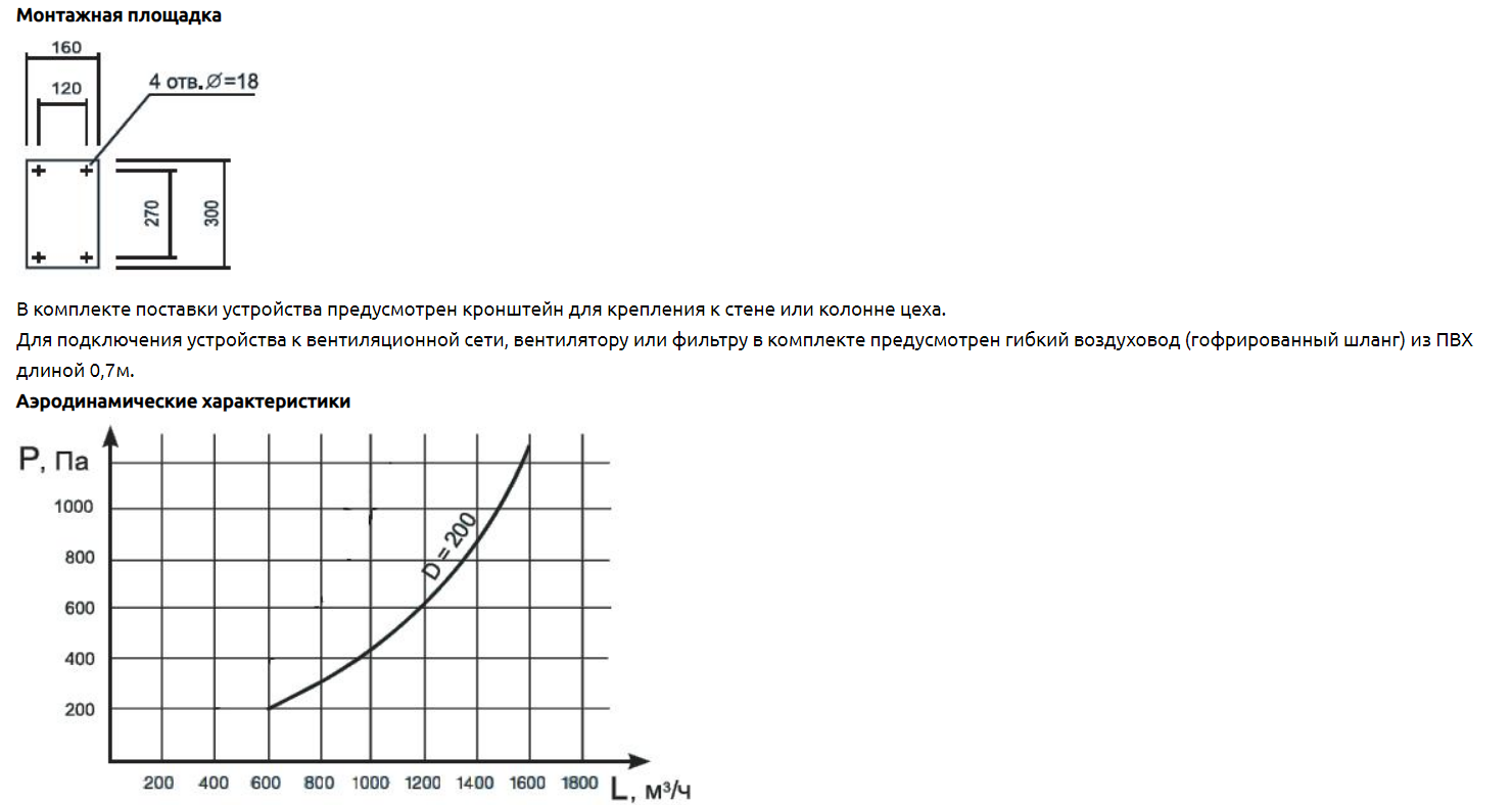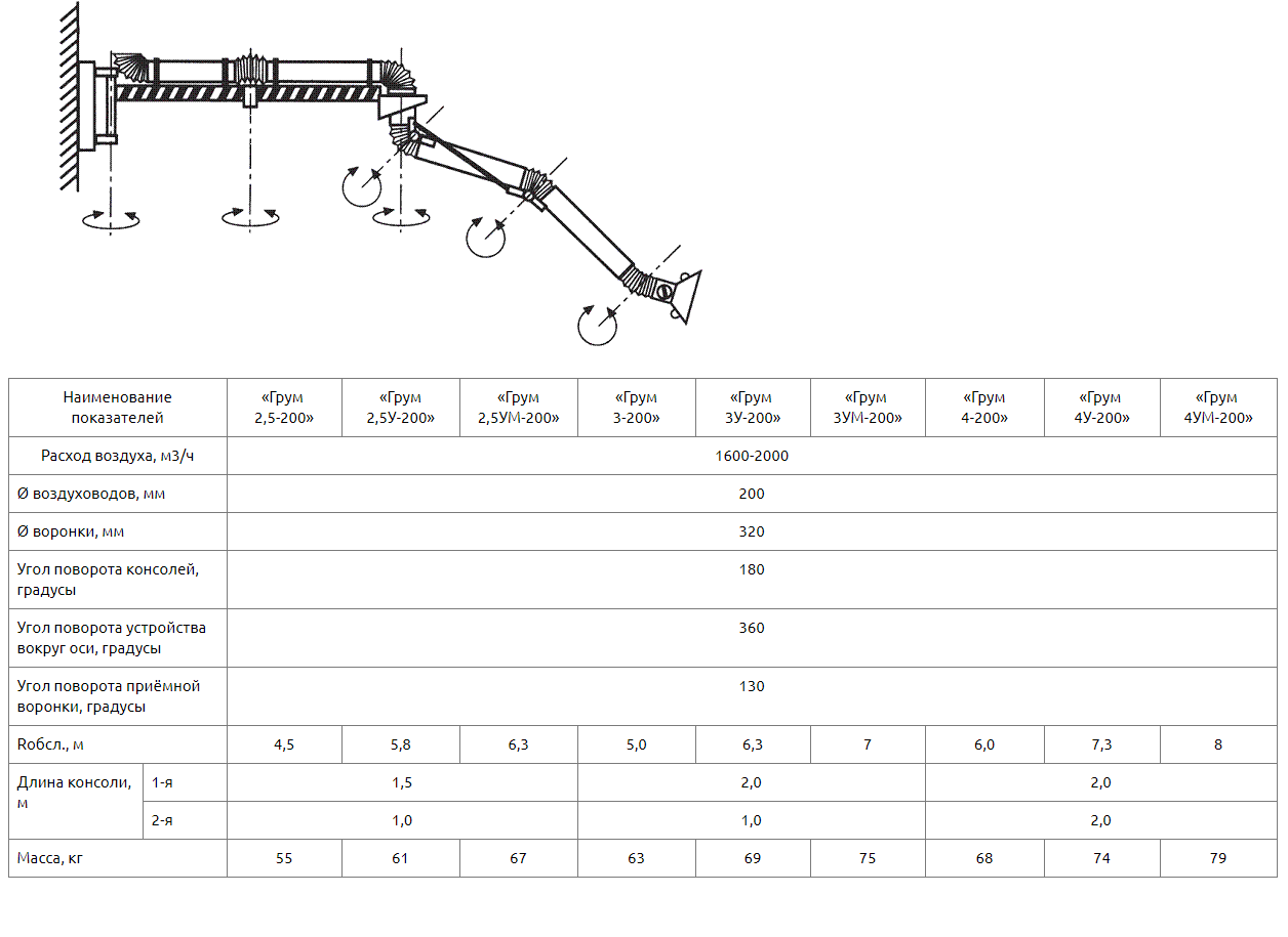 Выпускаемые устройства диаметром воздуховодов 200мм диаметром воронки 320мм рассчитаны на расход воздуха 1600-2000 м3/ч. Устройства «Грум-200» с консолями длиной 2,5(1,5+1)м, 3(2+1)м, 4(2+2)м, что позволяет обеспечивать радиус обслуживания до 8м. Радиус обслуживания зависит от длины используемой консоли и головной части – самофиксирующегося в пространстве устройства радиусом обслуживания 2м (без индекса), 3,2м (с индексом «У»), 4м (с индексом «УМ»). В конструкции устройства предусмотрен кронштейн для крепления к стене или колонне цеха. Поворотный кронштейн консоли обеспечивает ей ход 180о, а закрепленное на ней самофиксирующиеся устройство 200 вращается под консолью на 360о вокруг своей оси. Рекомендуемая высота установки устройства 2-2,25м. Устройство верхнего подключения (под опорой). Для подключения устройства к вентиляционной сети, вентилятору или фильтру в комплекте предусмотрен гибкий воздуховод (гофрированный шланг) длиной 0,7м.