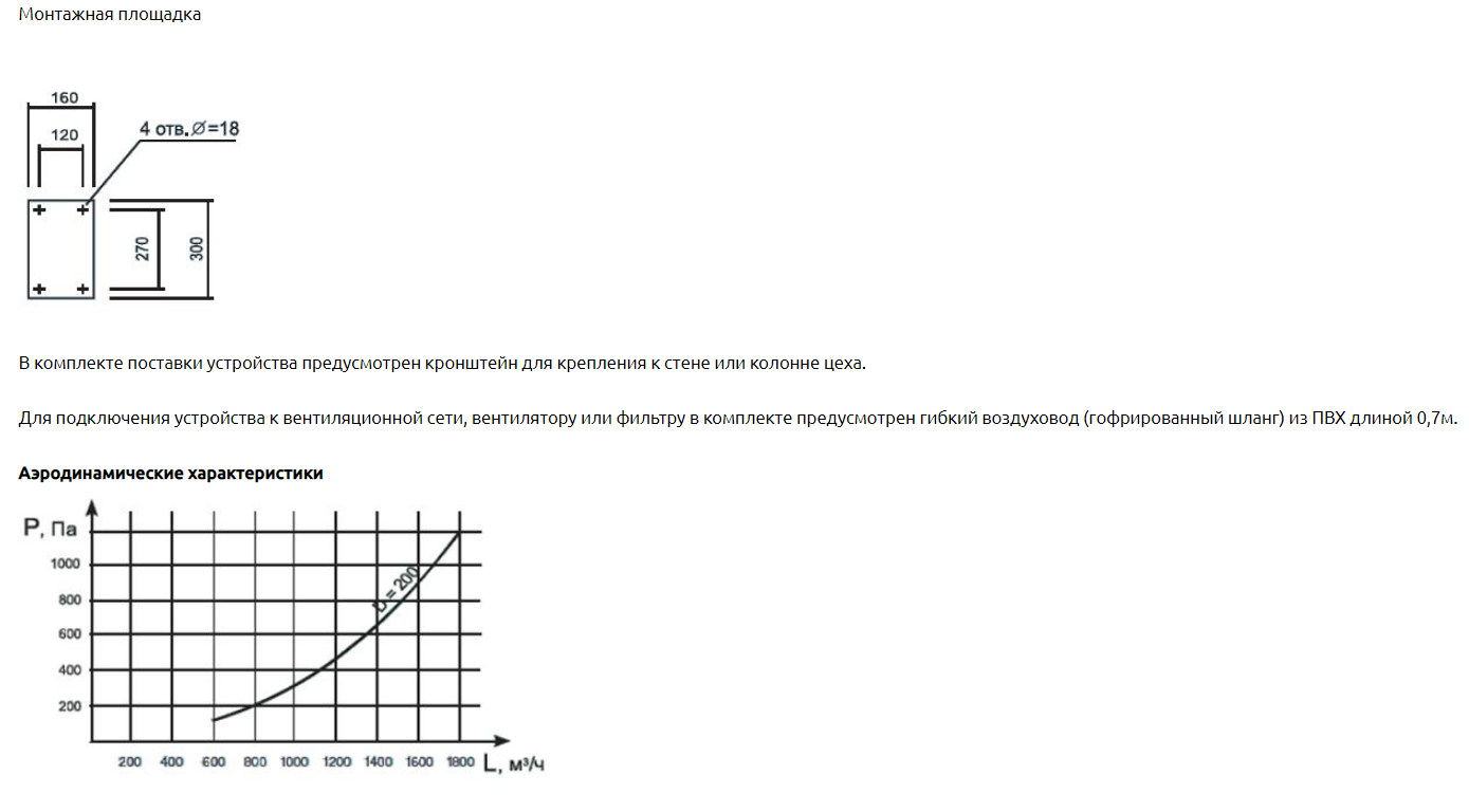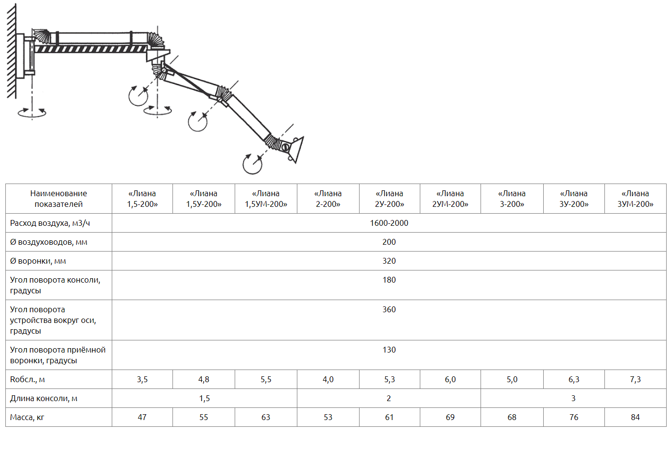 Выпускаемые устройства диаметром воздуховодов 200мм диаметром воронки 250мм рассчитаны на расход воздуха 1600-2000 м3/ч. Устройства «Лиана-200» с консолями длиной 1,5м, 2м, 3м, что позволяет обеспечивать радиус обслуживания до 7,3м. Радиус обслуживания зависит от длины используемой консоли и головной части – самофиксирующегося в пространстве устройства радиусом обслуживания 2м (без индекса), 3,2м (с индексом «У»), 4м (с индексом «УМ»). В конструкции устройства предусмотрен кронштейн для крепления к стене или колонне цеха. Поворотный кронштейн консоли обеспечивает ей ход 180о, а закрепленное на ней устройство «Лиана-160» вращается под консолью на 360о вокруг своей оси. Рекомендуемая высота установки устройства 2-2,25м. Устройство верхнего подключения (под опорой). Для подключения устройства к вентиляционной сети, вентилятору или фильтру в комплекте предусмотрен гибкий воздуховод (гофрированный шланг) длиной 0,7м.