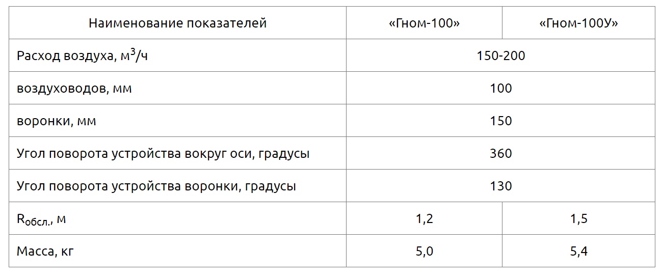 Выпускаемые устройства диаметром воздуховодов 100мм диаметром воронки 150мм рассчитаны на расход воздуха 150-200 м3/ч. Устройства «Гном-100У» радиусом обслуживания до 1,5м. В конструкции устройства предусмотрен кронштейн для крепления к стене или колонне цеха, металоконструкциям. Рекомендуемая высота установки устройства 40-50см над рабочей поверхностью. Устройство верхнего подключения (под опорой). Для подключения устройства к вентиляционной сети, вентилятору или фильтру в комплекте предусмотрен гибкий воздуховод (гофрированный шланг) диаметром 110мм, длиной 0,5м.
