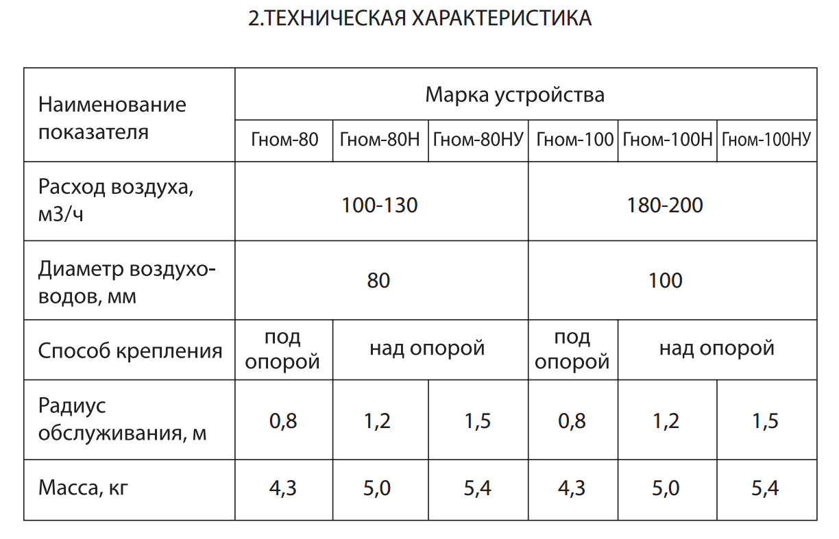Выпускаемые устройства диаметром воздуховодов 80мм диаметром воронки 150мм рассчитаны на расход воздуха 100-150 м3/ч. Устройства «Гном-80У» радиусом обслуживания до 1,5м. В конструкции устройства предусмотрен кронштейн для крепления к стене или колонне цеха, металоконструкциям. Рекомендуемая высота установки устройства 40-50см над рабочей поверхностью. Устройство верхнего подключения (под опорой). Для подключения устройства к вентиляционной сети, вентилятору или фильтру в комплекте предусмотрен гибкий воздуховод (гофрированный шланг) диаметром 90мм, длиной 0,5м.