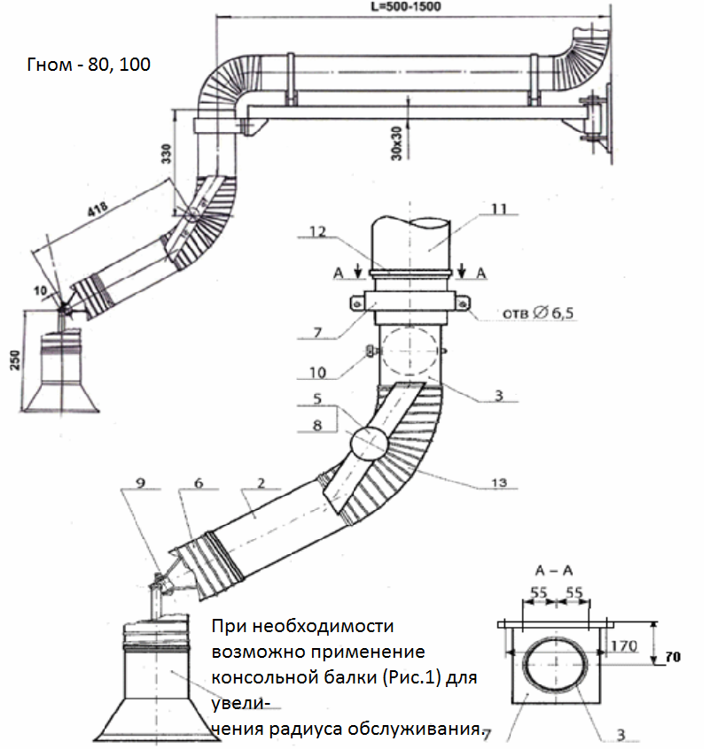 В тех случаях, когда радиуса обслуживания устройства Гном не достаточно можно использовать консоли марки «КГ-80» различной длины, что позволяет увеличить радиус обслуживания устройства до 2,1м. Выпускаются консоли длиной 0,5м («КГ-80-0,5»); 1,0м («КГ-80-1,0»); 1,5м («КГ-80-1,5»).
